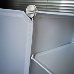 Opening door provides easy access to shoes even in a stack of multiple units or on a high shelf.