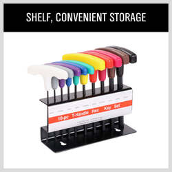 Upgrade your tool collection with the HORUSDY 10Pc T-Handle Hex Key Set. The T-handle design provides increased turning power and a comfortable grip, making it ideal for home, shop, workplace, and workbench use. The set includes color-coded hex keys made of heat-treated steel with a black oxide finish, offering excellent corrosion resistance and durability. The set comes with a steel organizer stand featuring mounting holes for convenient storage and easy access. Each handle is marked with the corresponding metric size, ranging from 2mm to 10mm. Enhance your efficiency and organization with this high-quality hex key set.