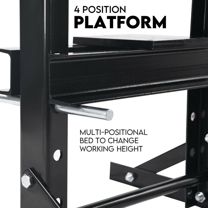 The TRADESMAN heavy-duty steel H-frame hydraulic garage/shop floor press is designed for straightening, bending, pressing bearings, installing bearings and stamping.The hydraulic cylinder is equipped with a 10-ton capacity bottle jack.