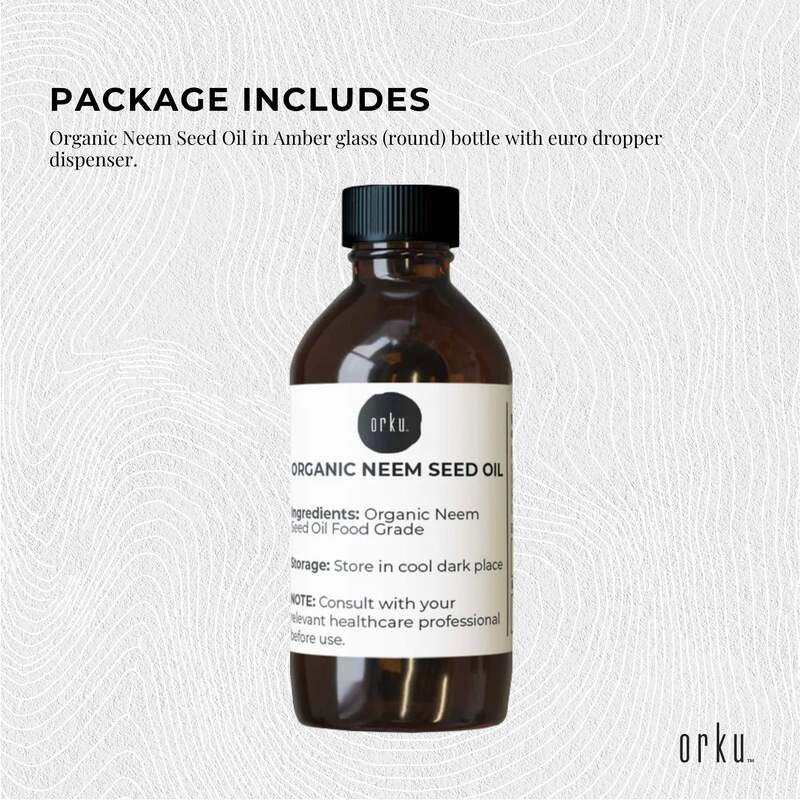 Organic Neem Seed Oil in Amber glass (round) bottle with euro dropper dispenser.