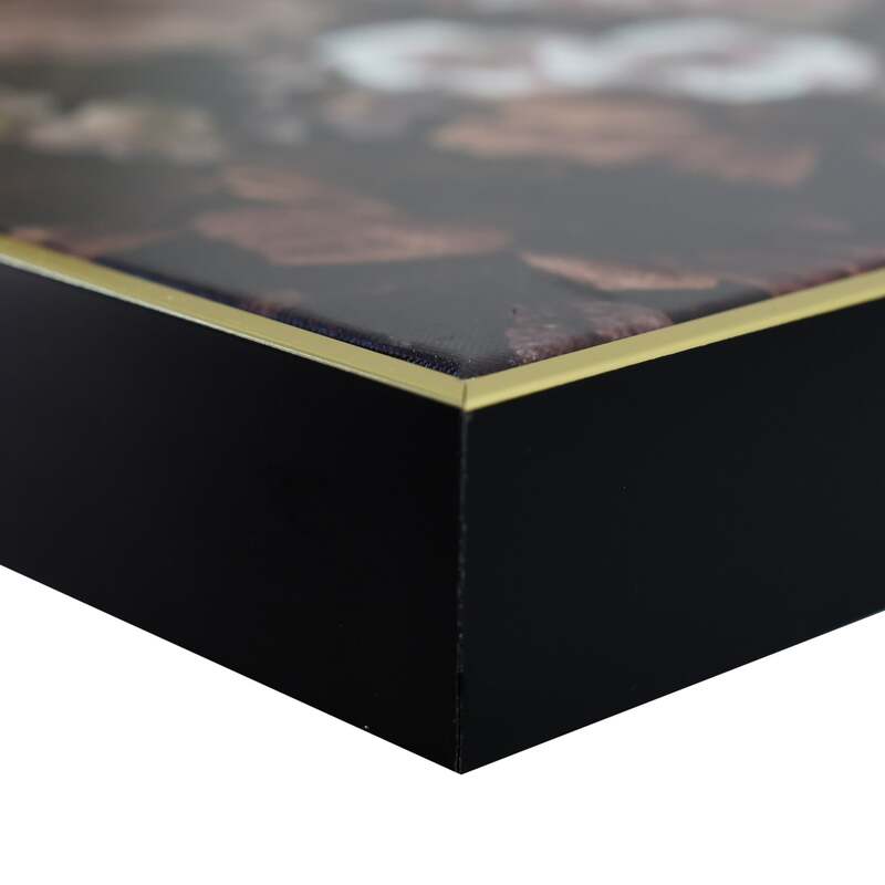 Stretched and gallery wrapped around a wooden stretcher and finished with a floating frame. There is a gap between the frame and print, which creates the floating effect and literally makes the canvas print stand out even more.