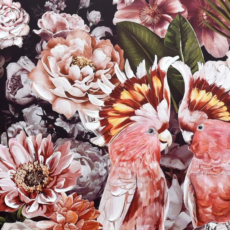 Dive into a world where love and nature intertwine in "Cockatoo Romance." This 100cm x 100cm artwork showcases a tender moment between two pink cockatoos, perched on a branch, their gaze locked in a gentle embrace. Their vivid pink tones stand out against a backdrop bursting with flowers, covering the canvas in a lush tapestry of reds and other dark tones. Every petal, feather, and leaf is brought to life with a combination of hand-painting and print, resulting in a perfect blend of precision and artistic flair. The gold frame elevates the artwork, adding a touch of opulence to the already rich composition. "Cockatoo Romance" is more than just a depiction of nature??t's a celebration of love, beauty, and the vibrant hues of life.