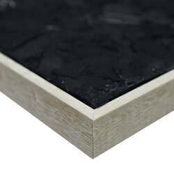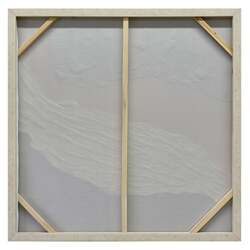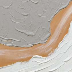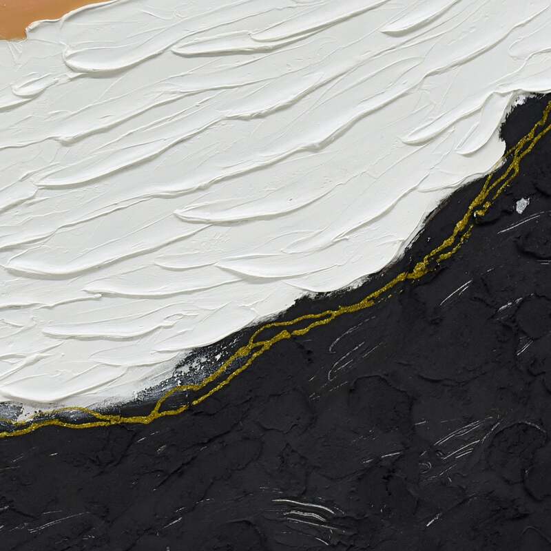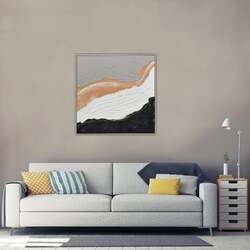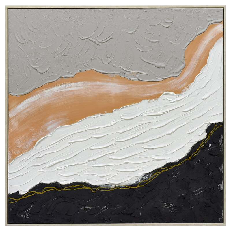 This captivating piece, "Golden Divide", is a symphony of contrasting hues and textures. The canvas comes alive with the fluid motion of sandy orange, reminiscent of a river serenely flowing between expanses of muted grey and pristine white. This tranquility is juxtaposed by bold strokes of black and charcoal, lending depth and drama to the composition. A thin, yet striking line of gold delineates the white from the black, acting as a luminous barrier, a beacon amidst the abstraction. Crafted with meticulous hand-painted strokes and a rich texture, the artwork is framed elegantly in light fir wood, amplifying its contemporary appeal. "Golden Divide" is not just an artwork, but a visual tale of separation, unity, and the subtle beauty that lies in between.
