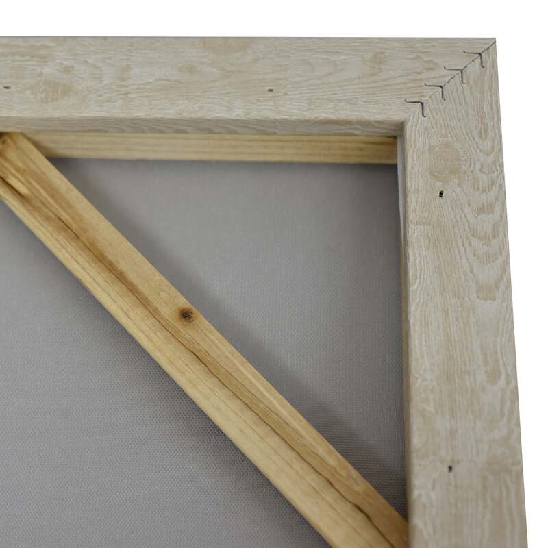 Stretched and gallery wrapped around a wooden stretcher and finished with a floating frame. There is a gap between the frame and print, which creates the floating effect and literally makes the canvas print stand out even more.