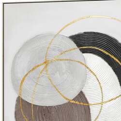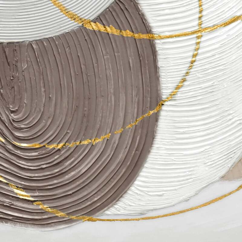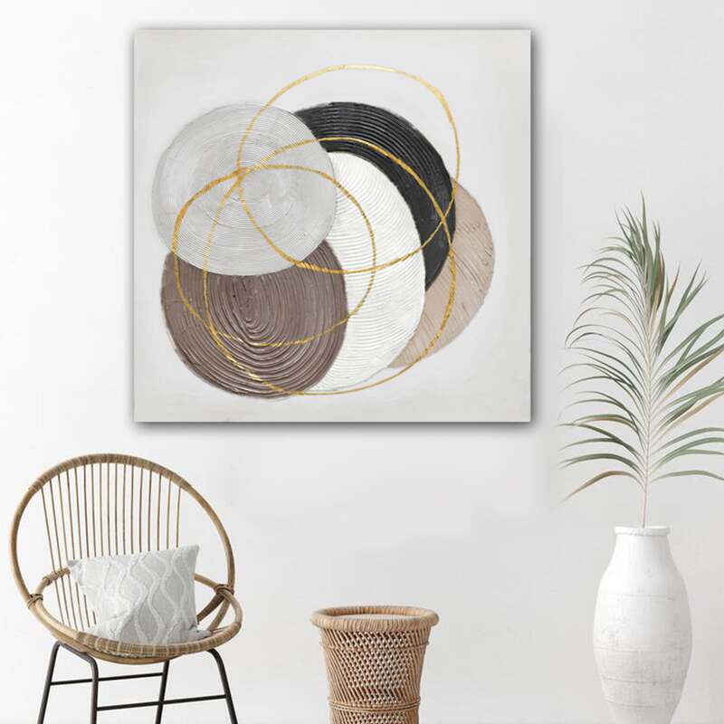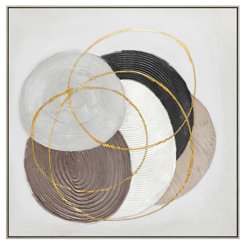 Dive into the mesmerizing world of "Martian Geometrics," a 100cm x 100cm artwork that masterfully blends abstraction with geometry. This hand-painted creation showcases five solid circles, each adorned with thick, circular groove textures. The harmonious palette of grey, brown, white, black, and beige gives each circle its own distinct character, creating a captivating visual narrative. Overlaying this base are three ethereal golden-outlined circles, adding a touch of opulence and intrigue to the composition. Set against a very light grey backdrop, these elements come together in a dance of color, form, and texture. Encased in a light wood frame, this piece, with its thick textured details, is a testament to the beauty of abstraction and the elegance of geometric design.