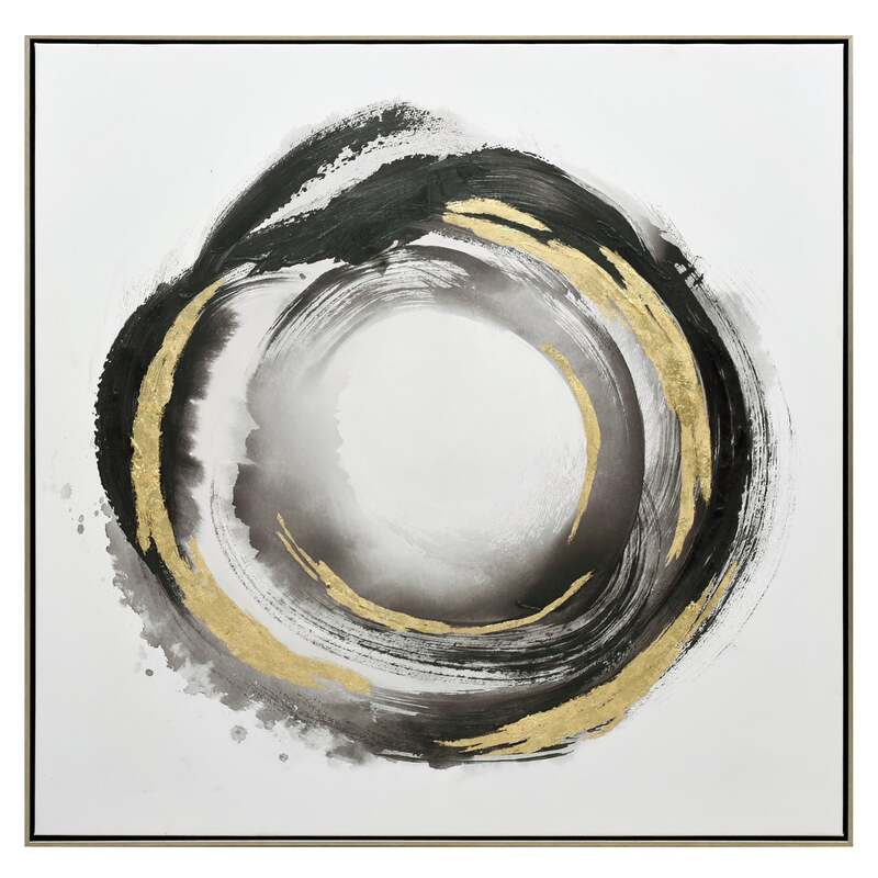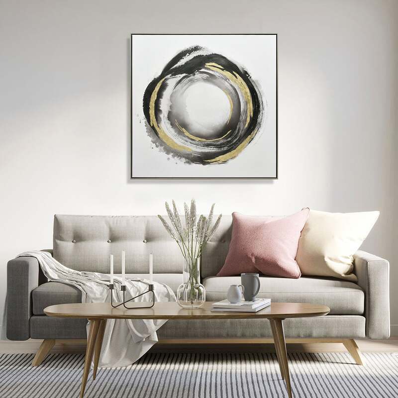 "Orbiting Elegance" is a harmonious blend of minimalism and intricate design. Set against a pristine white backdrop, the artwork draws attention to its centerpiece: a meticulously crafted circle, composed of overlapping strokes in black, grey, white, and gold. Each stroke is a testament to the artist's precision, effortlessly transitioning from one hue to the next, creating a rhythmic dance of colors. The gold accents, in particular, add a touch of opulence, making the circle gleam and shimmer as light interacts with it. Encased in a champagne-hued frame, the artwork exudes sophistication, making it a perfect addition to contemporary spaces. Crafted with a harmonious blend of hand-painted and printed techniques, "Orbiting Elegance" beckons viewers to appreciate the beauty in simplicity and the elegance in details.