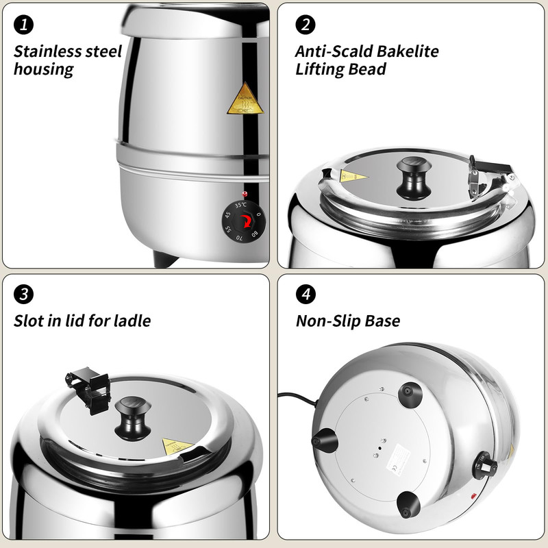 With a generous 10.5-quart (10L)capacity, this soup warmer is perfect for larger gatherings. Constructed with food-grade stainless steel inner pot, it ensures durability and safe food handling.