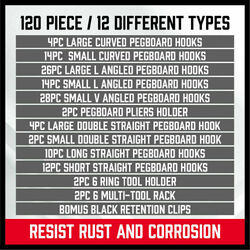 - 12 different types of hooks and organizers for a variety of hanging applications. Total 120 PCS