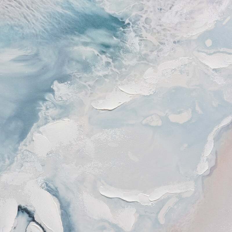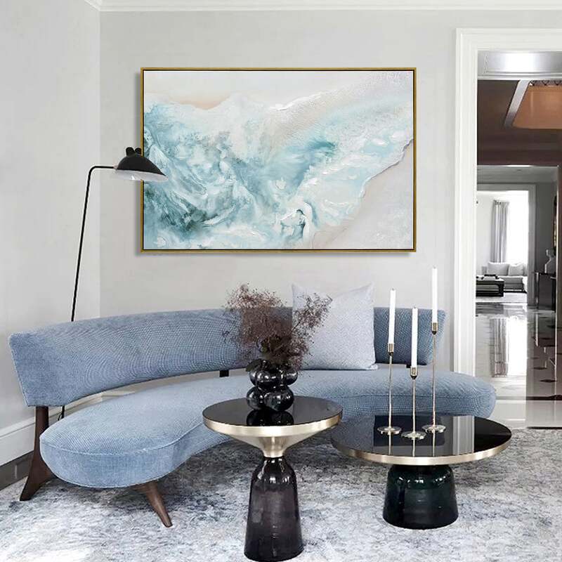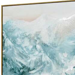 "Wave's Embrace" invites you to experience the gentle meeting of ocean and shore from a unique aerial perspective. Spanning 120cm x 80cm, this artwork captures the mesmerizing moment when a blue-toned wave, frothing with white, breaks gracefully onto pristine sand. The meticulous blend of hand-painting and print showcases the dynamic dance between the ocean's power and the softness of the beach. Encased in a sophisticated dark wood frame, the canvas paints a vivid picture of nature's tranquility and the ephemeral beauty of coastal landscapes. Whether it's the rhythmic flow of the water or the untouched purity of the sand, "Wave's Embrace" serves as a serene reminder of nature's harmonious balance.