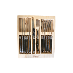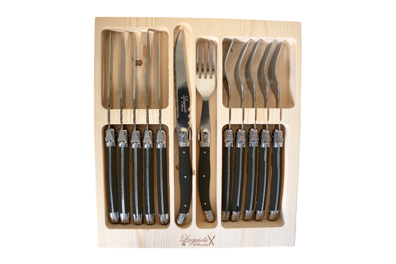 Laguiole Silhouette is a premium range epitomising quality and elegance. The 12-piece Black Steak Knife and Fork set packaged in the Traditional pine gift boxing is a great gift or personal purchase to finish a table setting in the most alluring way.
