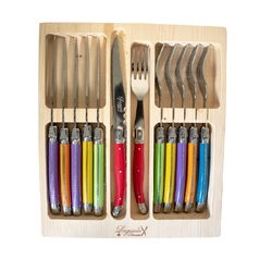 Laguiole Silhouette is a premium range epitomising quality and elegance. The 12-piece Multi-Colour Steak Knife and Fork set packaged in the Traditional pine gift boxing is a great gift or personal purchase to finish a table setting in the most alluring way.