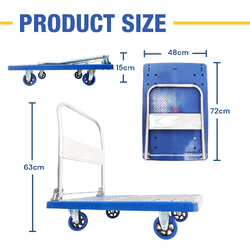 The platform dolly cart's clever foldable design allows for easy storage when not in use. When folded down to approximately 48cm x 72cm x 15cm, it takes up minimal space, making it ideal for smaller storage areas or transporting in vehicles.