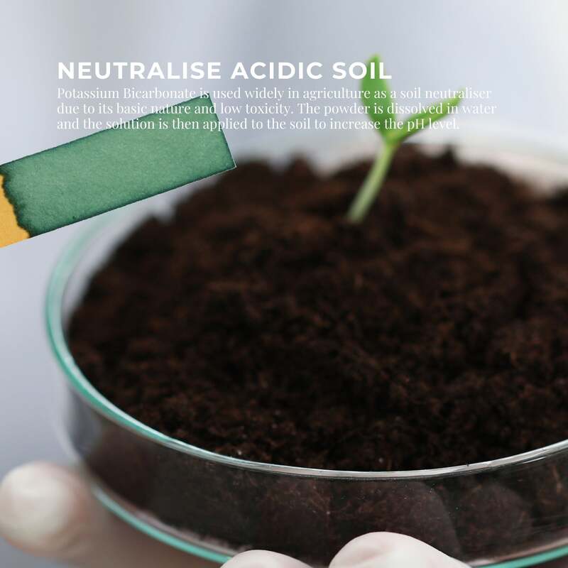 Potassium Bicarbonate is used widely in agriculture as a soil neutraliser due to its basic nature and low toxicity. The powder is dissolved in water and the solution is then applied to the soil to increase the pH level.