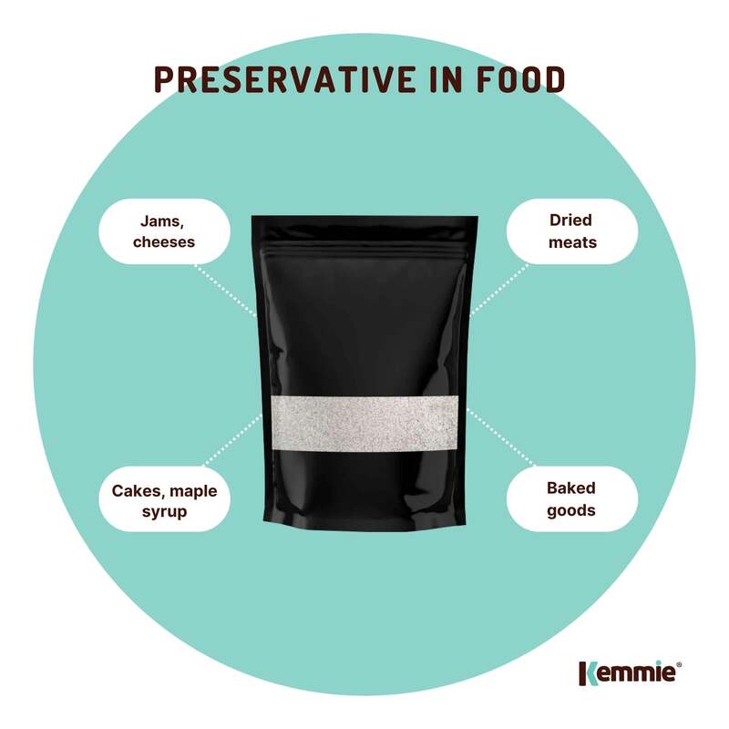 - Preservative in food (E202) - jams, cheeses, dried meats, cakes, maple syrup, baked goods