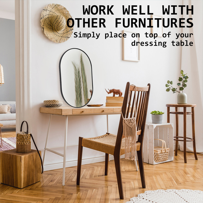 The oval mirror is stylish and neat in design comes with a 2.8cm thickness slender aluminium frame that is sure to capture the attention of all. Plus, its curved lines all rounds will become a central focal point in any room which makes spaces feel more inviting and relaxing.