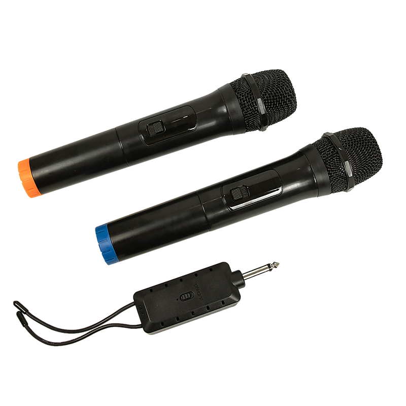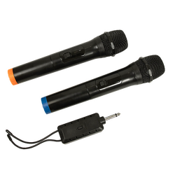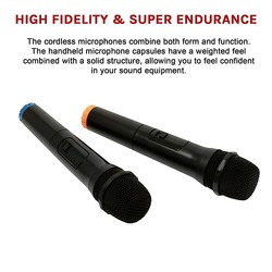 The cordless microphones combine both form and function. The handheld microphone capsules have a weighted feel combined with a solid structure, allowing you to feel confident in your sound equipment. With a 50m long-distance transmission, you don't have to worry about limiting your movement once plugged into your mixer, portable speaker or projector.