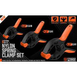 - 20-piece nylon spring clamp set with 3.5-inch clamps (x10), 4.3-inch clamps (x6), and 6.3-inch clamps (x4)