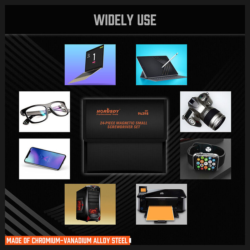 Experience the durability and precision of the HORUSDY 24-Piece Magnetic Precision Screwdriver Set. Crafted from high-strength chrome vanadium steel, these screwdrivers feature magnetized tips for secure screw handling. The set includes a variety of sizes for slotted, Phillips, and Torx screws, along with tweezers and a magnetizer. Each screwdriver is color-coded for easy recognition, and the ergonomic non-slip handle ensures comfortable and efficient work. With its compact storage bag, this set is ideal for electronics, watch repair, jewelry repair, and other projects that require delicate handling.