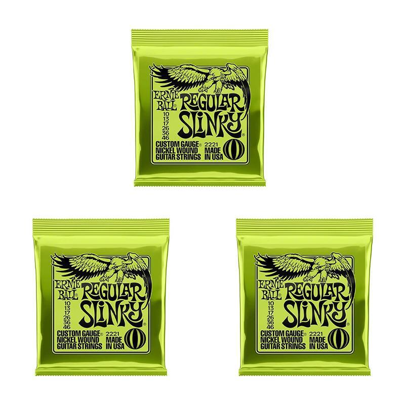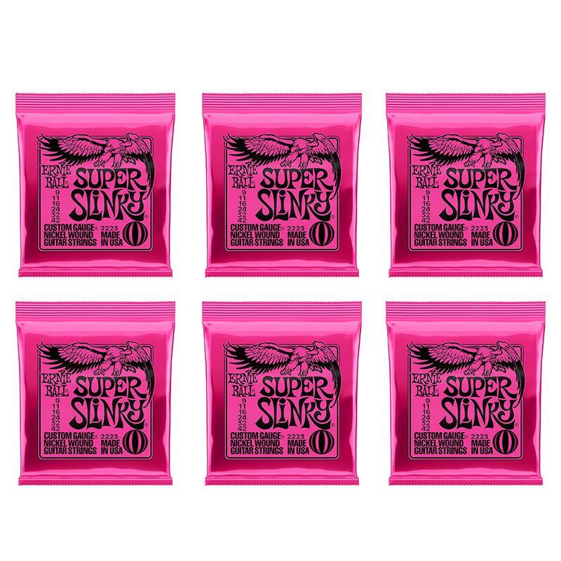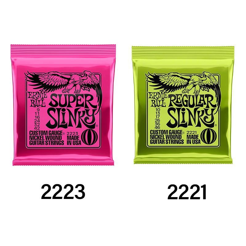Features:2223 (009-042) Super-SlinkyEB-2223 Super Slinky Electric Guitar Strings feature nickel-plated steel wire wrapped around tin-plated, hex-shaped, steel core wire. Slinky strings provide a vibrant, bright, lasting tone and reduce fret wear. This weight balances the maximum response from your pickups with playability and bendability.Ernie Ball replacement strings are precision manufactured to the highest standards and most exacting specs to assure consistency, optimum performance, and long life.The plain strings are made of specially tempered tin plated high carbon steelSuper Slinky wound strings are made from nickel-plated steel wire wrapped around a hex-shaped steel core wireGauges .009 .011 .016 .024 .032 .0422221 (010-046) Regular-SlinkyErnie Ball 2221 Regular Slinky Electric Guitar Strings feature nickel-plated steel wire wrapped around tin-plated, hex-shaped, steel core wire. Slinky strings provide a vibrant, bright, lasting tone and reduce fret wear. This weight balances the maximum response from your pickups with playability and bendability.Ernie Ball replacement strings are precision manufactured to the highest standards and most exacting specs to assure consistency, optimum performance, and long life.