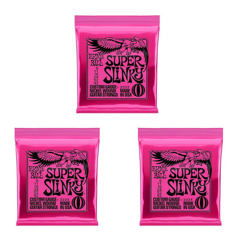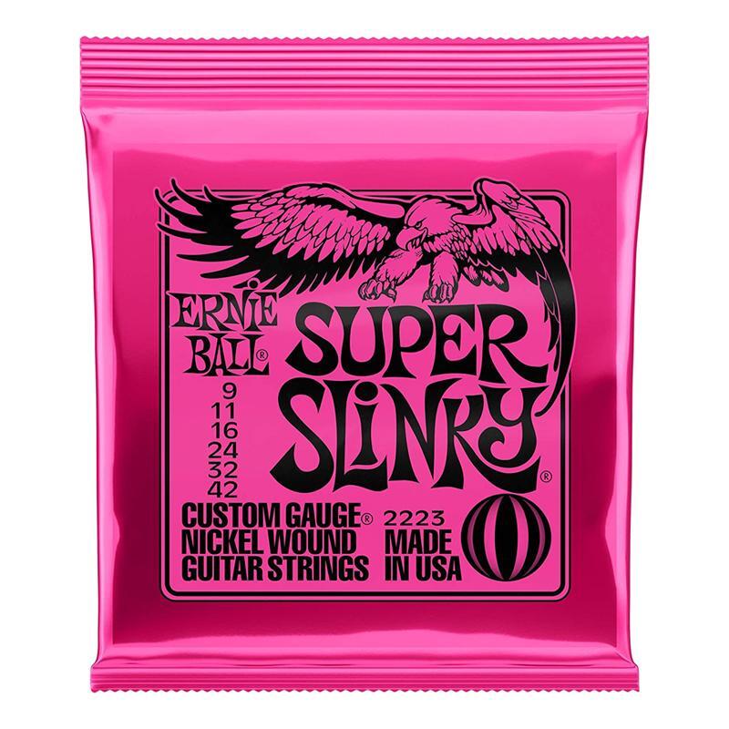 Features:2223 (009-042) Super-SlinkyEB-2223 Super Slinky Electric Guitar Strings feature nickel-plated steel wire wrapped around tin-plated, hex-shaped, steel core wire. Slinky strings provide a vibrant, bright, lasting tone and reduce fret wear. This weight balances the maximum response from your pickups with playability and bendability.Ernie Ball replacement strings are precision manufactured to the highest standards and most exacting specs to assure consistency, optimum performance, and long life.The plain strings are made of specially tempered tin plated high carbon steelSuper Slinky wound strings are made from nickel-plated steel wire wrapped around a hex-shaped steel core wireGauges .009 .011 .016 .024 .032 .0422221 (010-046) Regular-SlinkyErnie Ball 2221 Regular Slinky Electric Guitar Strings feature nickel-plated steel wire wrapped around tin-plated, hex-shaped, steel core wire. Slinky strings provide a vibrant, bright, lasting tone and reduce fret wear. This weight balances the maximum response from your pickups with playability and bendability.Ernie Ball replacement strings are precision manufactured to the highest standards and most exacting specs to assure consistency, optimum performance, and long life.