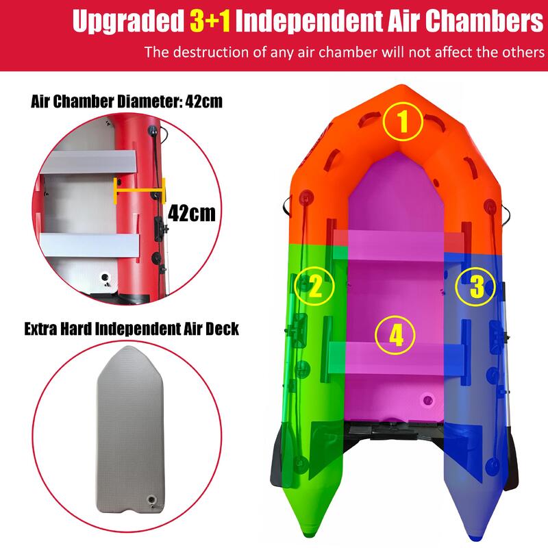Upgraded Anti-Stress Air Deck Hard and Stable: Upgraded with anti-stress air deck bottom, after inflation it can cover the entire bottom, feels like hard board, which is more stable and no deformation! Also the air deck also serves as a separate air chamber to provide additional buoyancy. If the inflatable boat breaks and leaks air, it can still stay afloat, which provides one more layer of security for life.