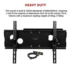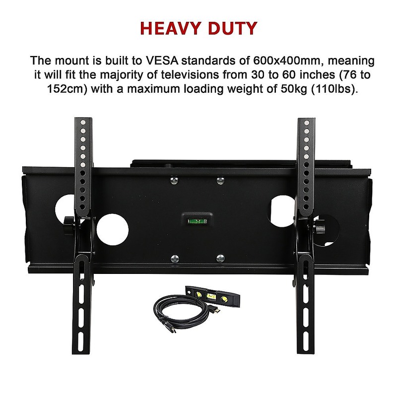 This sturdy mount is designed for Australian-standard stud spacings and will fit just right between two 420mm-spaced studs. Accordingly, the mount is built to VESA standards of 600x400mm, meaning it will fit the majority of televisions from 30 to 60 inches (76 to 152cm) with a maximum loading weight of 50kg (110lbs). The mount can also be affixed to brick and concrete walls with the right tools.