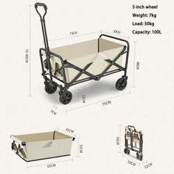 5 Inch Wheel Beige Folding Beach Wagon Cart Trolley Garden Outdoor Picnic Camping Sports Market Collapsible Shop