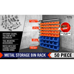 Efficiently organize your garage with this 50-Piece Wall Mounted Bin Storage Rack. The kit includes 35 small bins and 15 large bins in two different colors, allowing for better distinction and easy labeling. Made of powder-coated steel, the rack features a top storage tray and solid chassis support for durability. The slots on top provide quick access to the bins, and the upgraded mounting slot design ensures extra stability. With a detachable bin design and customizable layout, this storage rack keeps your work area neat and tidy while providing a perfect solution for tools and accessories storage.