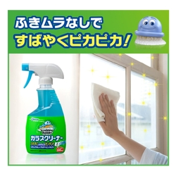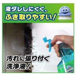 Glass cleaner with a cleaning solution that sticks to dirt, which does not sag on vertical surfaces and makes it easy to wipe off