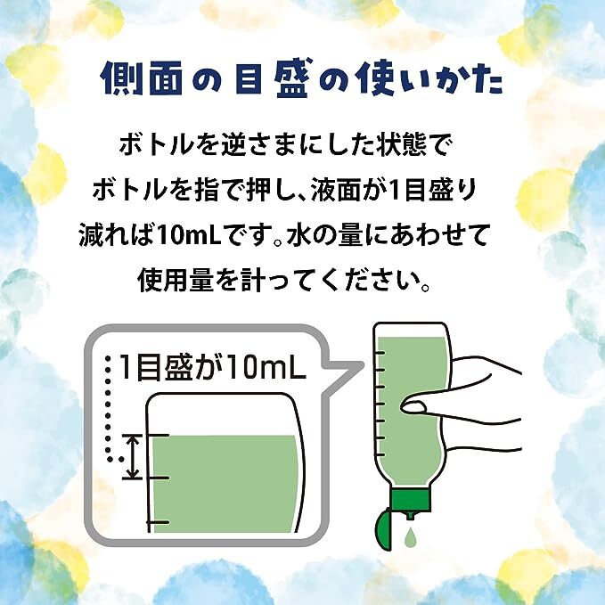 For soaking, about 10 mL per 500 mL of water or lukewarm water (1 scale on the side of the bottle: turn the bottle upside down and measure). For machine washing, use an appropriate amount according to the amount of dirt.