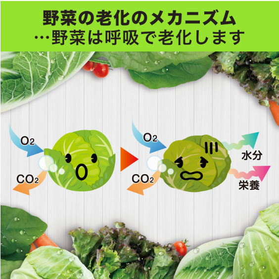 The power of carbon dioxide gas slows down the "breathing" that causes aging of vegetables and keeps vegetables fresh.