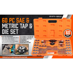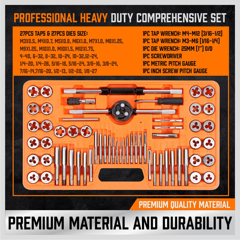 20x SAE Fractional taps and dies for coarse thread (UNC): 4-40 NC, 6-32 NC, 8-32 NC, 10-24 NC, 12- 24 NC, 1/4-20 NC, 5/16-18 NC, 3/8-16 NC, 7/16-14 NC, 1/2-13 NC