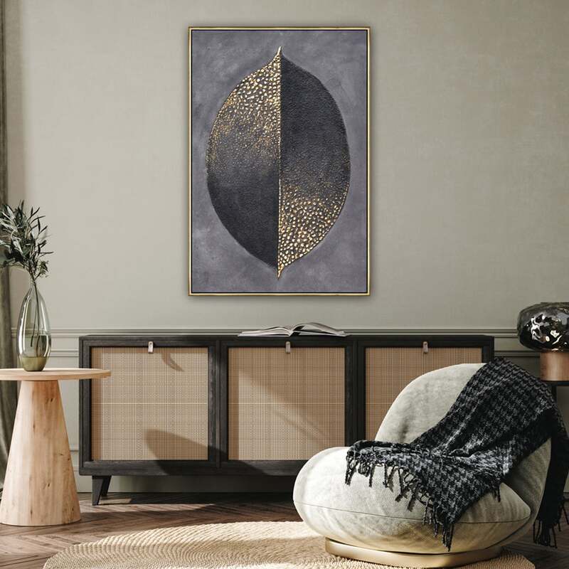 "Golden Dichotomy" is a 60cm x 90cm captivating piece of artistry, where contemporary design meets profound symbolism. Against a muted grey backdrop, a central sphere steals the limelight, meticulously hand-painted in shades of dark grey with opulent gold textures. This orb, with its intriguing sharp points extending from the top and bottom, becomes even more compelling due to its central split. Each side of this divide serves as an inverted reflection of the other, creating a mirror-like representation. The symmetrical design, combined with the thick texture, the subtle glint from little stones, and the gold highlights, renders a sense of balance and unity. Encased in a luxurious gold frame, "Golden Dichotomy" stands as a testament to the beauty of contrast and the harmony that emerges from it.