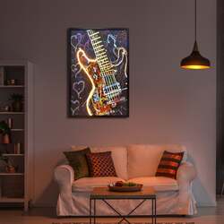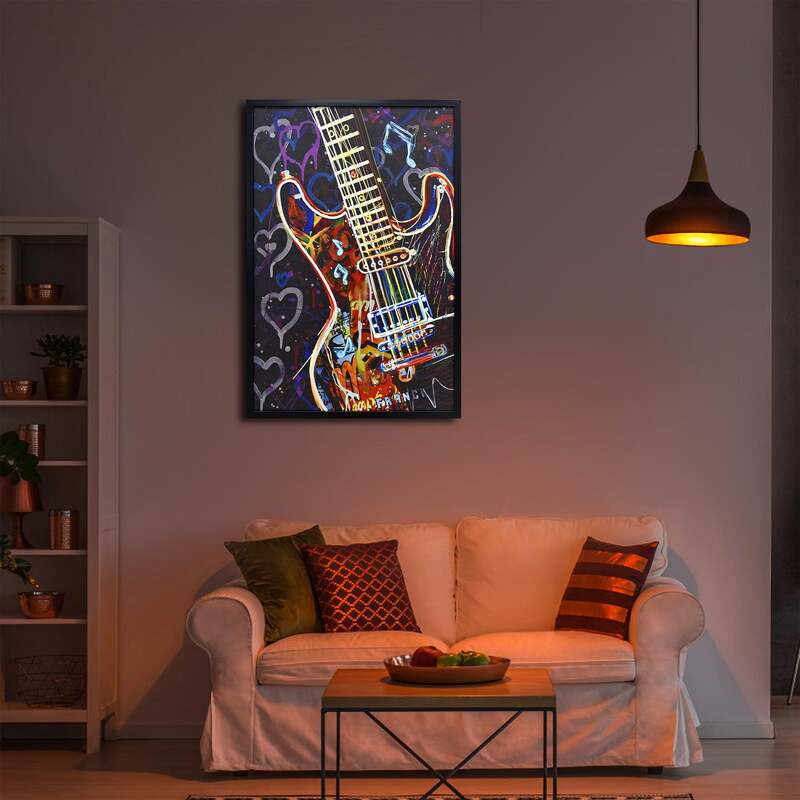 Encased in a sleek black frame, "Neon Serenade" comes alive as a vibrant 60cm x 90cm fusion of art forms. This eclectic piece blends the tactile appeal of hand-painting with the modern allure of LED illumination and the raw energy of print. At its heart, a graffiti-styled guitar in vivid pop colours takes center stage, its form accentuated by a luminescent LED strip that traces half its outline, casting a radiant glow and imbuing the artwork with a dynamic rhythm. This electric instrument is set against a spirited backdrop teeming with graffiti hearts and music note symbols, each one a testament to the universal language of love and music. As these elements converge, "Neon Serenade" emerges not just as a visual spectacle but as an ode to the rebellious spirit of rock 'n' roll and the passions that drive us.