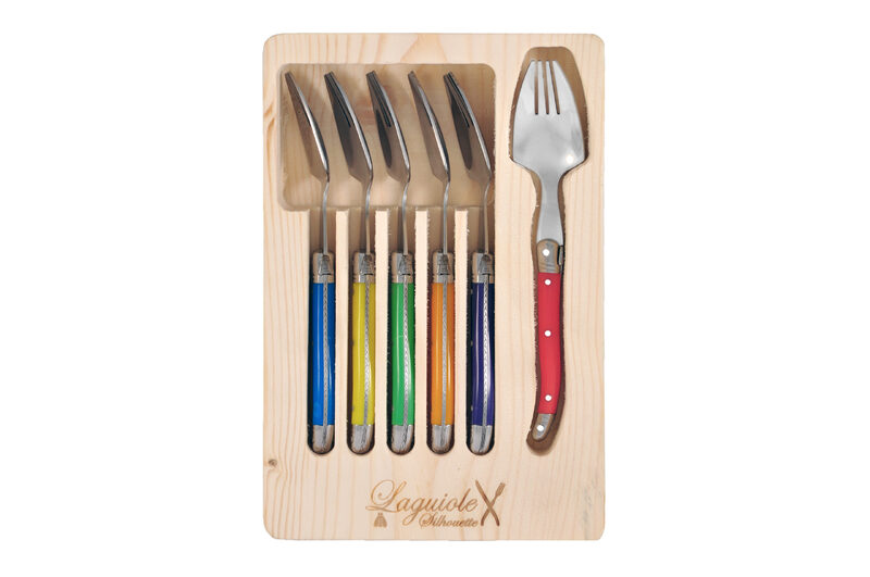 Laguiole Silhouette is a premium range epitomising quality and elegance. The Multi Colour Six-Piece Spork Set is presented in the pine wood traditional presentation boxing and is a great gift or personal purchase to finish a table setting in the most alluring way.