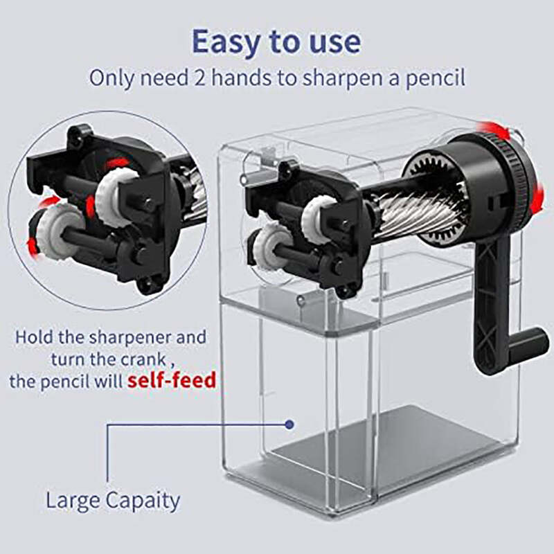 Large Capacity Reservoir: The reservoir of this pencil sharpener is extra large and can hold more at a time, which means you don?? have to dump the shavings every few uses, you just focus on consecutively sharpening.