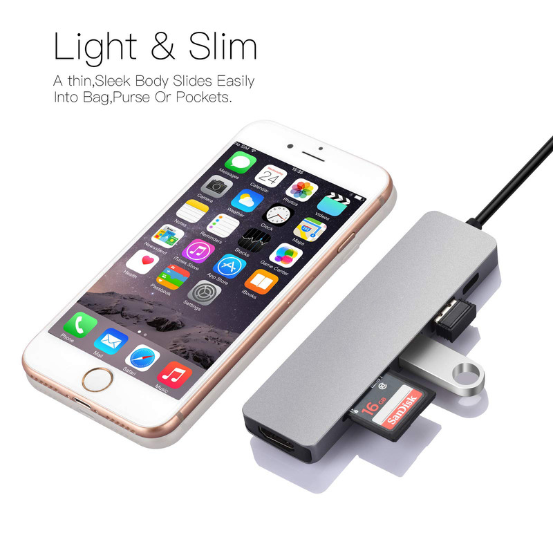 The intelligent USB C Adapter has perfectly combined all the functions you need. USB C to HDMI hub equipped with USB3.0 x2, 4K@30 HDMI, SD/TF Card Adapter, and Up to 55W/20V/5A Type C Power Delivery charging port.