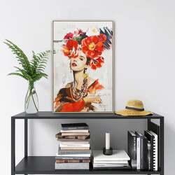 "Blossom Adorned" captivates with the sublime fusion of tradition and nature's beauty. At its center is the portrait of a woman, her lips painted with a striking shade of red, complementing her traditional outfit. The intricate beaded chains around her neck drape gracefully, showcasing her regal demeanor, while the large gold earrings add an aura of opulence. Yet, what truly elevates this piece to a realm of enchantment is her head, adorned not with hair, but a lush cascade of red and white flowers. One of these blossoms gently obscures her eye, adding a touch of mystery and allure. Crafted with a harmonious blend of hand-painted elements and print, the artwork is framed elegantly in light fir wood, creating a delicate balance between its vibrant and muted tones. "Blossom Adorned" is a testament to the timeless beauty of tradition, intertwined with the ethereal charm of nature.