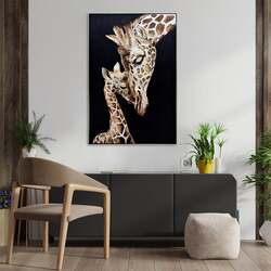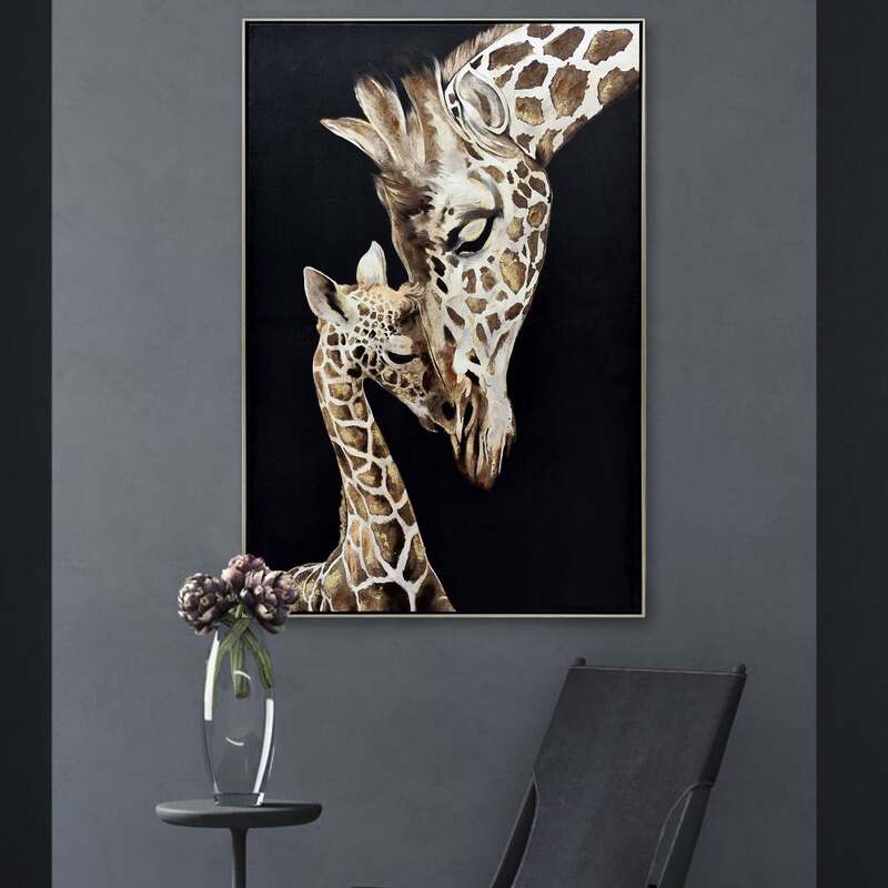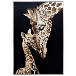 "Tender Touch" is a poignant portrayal of the bond between mother and child. Set against a stark black backdrop, two giraffes emerge as the focal points, their heads gently touching in a moment of pure affection. The adult mother giraffe, regal and protective, leans towards the younger one, their eyes closed as if savoring the moment. The baby giraffe, innocent and trusting, reciprocates this gesture, symbolizing the universal language of love and care. The artwork's contrast between the deep black background and the detailed portrayal of the giraffes creates a powerful visual impact, drawing viewers into the emotional depth of the scene. Encased in a champagne-hued frame and crafted with a harmonious blend of hand-painted elements and print, "Tender Touch" stands as a testament to the timeless and profound connection between a parent and their offspring.