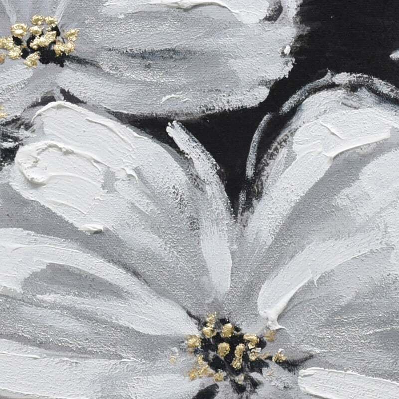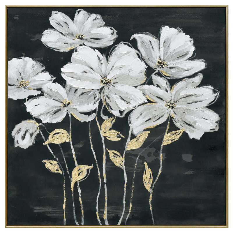 Dive into an enchanting realm of elegance and luxury with "Golden Blossoms," an 80cm x 80cm hand-painted masterpiece. Set against a deep black-grey canvas, pristine white flowers emerge, standing tall and radiant. Their ethereal beauty is further accentuated by the lavish gold leaves that sprout from their stems, and the shimmering gold highlights that adorn their petals and centers. The thick texture of the paint adds depth and dimension, making each flower come alive, as if ready to sway with the gentlest breeze. Encased in a lavish gold frame, this artwork is not just a visual treat??t's a symphony of contrast, with the purity of the blossoms set against the opulence of gold and the intensity of the background. "Golden Blossoms" is a tribute to nature's elegance and the artistry of hand-painting, making it a perfect centerpiece for any sophisticated space.