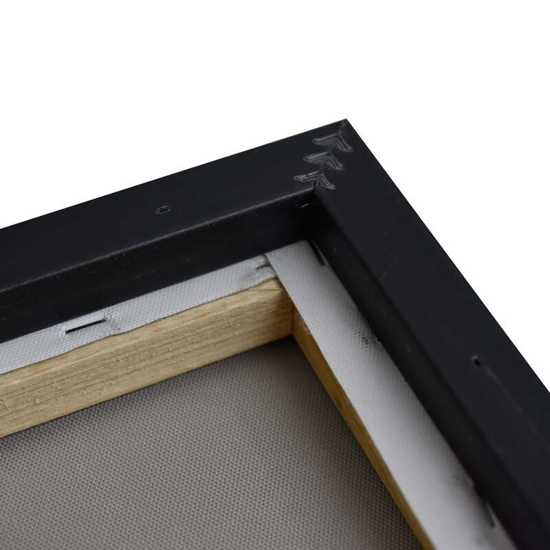 Stretched and gallery wrapped around a wooden stretcher and finished with a floating frame. There is a gap between the frame and print, which creates the floating effect and literally makes the canvas print stand out even more.