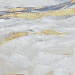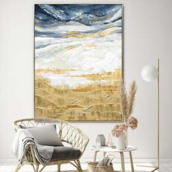 "Golden Horizon" captures the breathtaking transition between sky, land, and sea in a mesmerizing abstract representation. This 90cm x 120cm artwork is a journey from the deep blues of the sky, enriched by gold highlight strokes, to the serene whites and beiges representing the pristine sands, and culminating in the gold and yellow hues that symbolize the land's warmth. The canvas masterfully balances the contrasting tones, evoking the tranquil ambiance of a coastal dusk. Every brushstroke, a blend of hand-painting and print, adds depth and texture, creating a vivid interplay of colors. Framed in a champagne toned frame, this piece is not only a visual treat but also an embodiment of nature's timeless beauty and the allure of abstract art.
