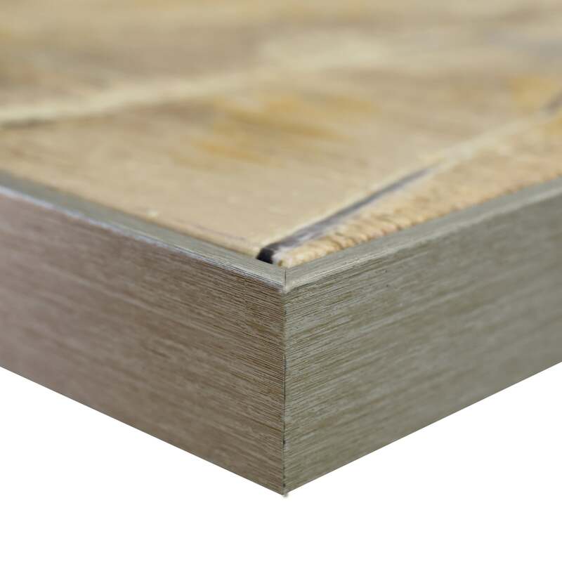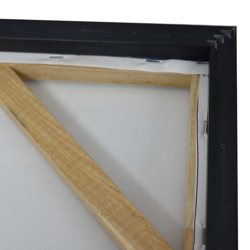 Stretched and gallery wrapped around a wooden stretcher and finished with a floating frame. There is a gap between the frame and print, which creates the floating effect and literally makes the canvas print stand out even more.