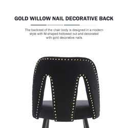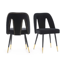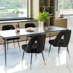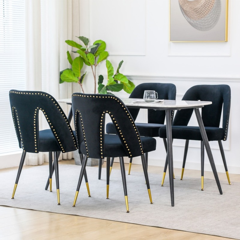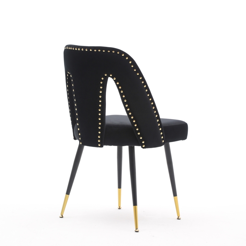 Our side chairs feature gold studs and gold-tipped black metal legs, bringing chic, modern style to your dining room in a cinch. Each chair has plastic glides on the feet to protect your floors from scratches and scuffs.