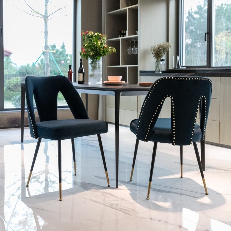 Our side chairs feature gold studs and gold-tipped black metal legs, bringing chic, modern style to your dining room in a cinch. Each chair has plastic glides on the feet to protect your floors from scratches and scuffs.