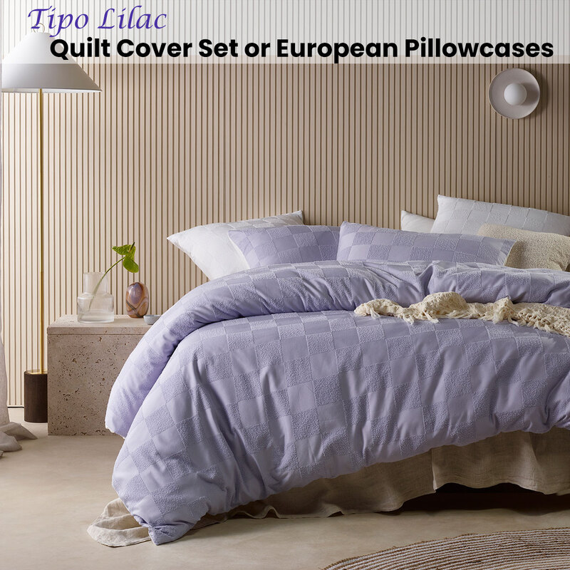 Change the look of your bedroom by adding some texture with Tipo Lilac Chenille Quilt Cover Set. This quilt cover set is made with a polyester front & plain cotton reverse, keeping you comfortable all night long. Our design features a chenille classic grid pattern across the quilt cover & pillowcases adding that chic, minimalist style that's suitable for any room. Complete the look with matching European pillowcases at an extra cost.