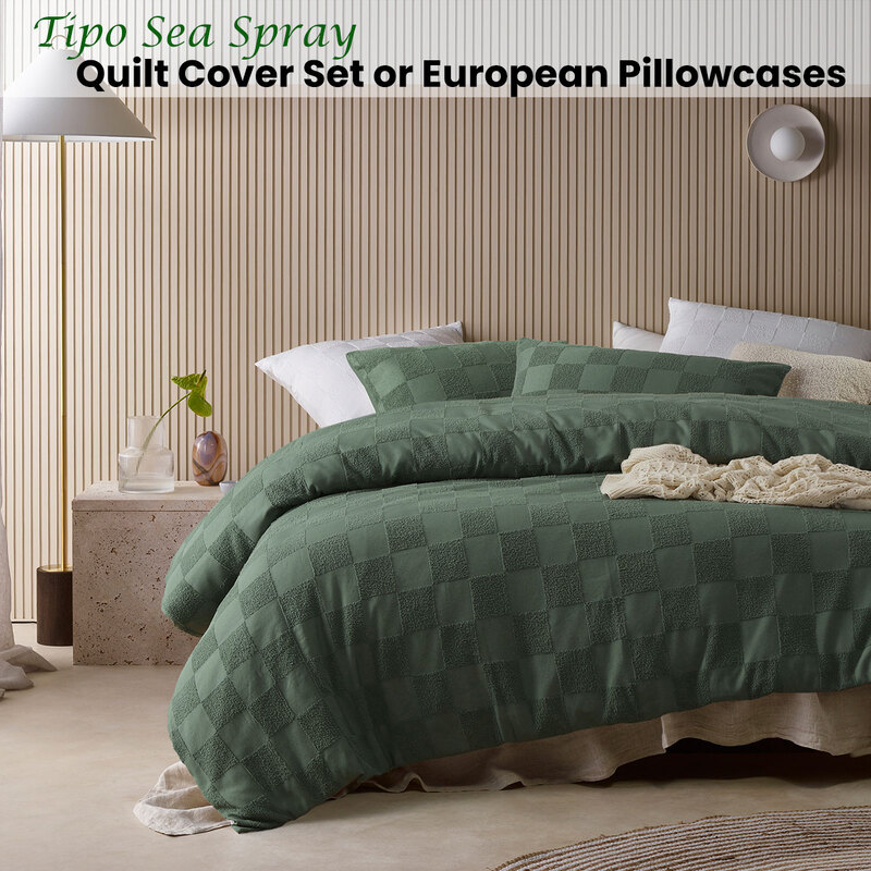 Change the look of your bedroom by adding some texture with Tipo Sea Spray Chenille Quilt Cover Set. This quilt cover set is made with a polyester front & plain cotton reverse, keeping you comfortable all night long. Our design features a chenille classic grid pattern across the quilt cover & pillowcases adding that chic, minimalist style that's suitable for any room. Complete the look with matching European pillowcases at an extra cost.