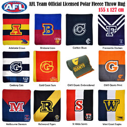 Make yourself comfortable and warm while giving support to your AFL team with this AFL Team Official Licensed Polar Fleece Throw by AFL. It features print and embroidery design of initial letters of AFL team together with their logos printed in their team colours on a stripe and dual colours background. It is made from easy care and high quality Polyester fabric.