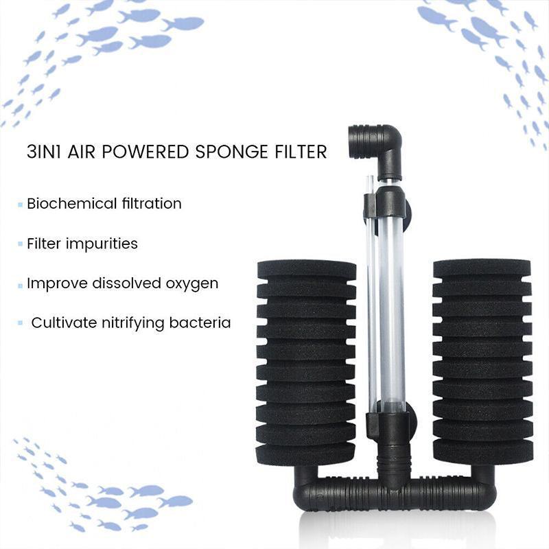 3IN1 AIR POWERED SPONGE FILTER: Filtration, aeration and cultivate nitrifying bacteria in one solution, keep the water well oxygenated, works great without noise. Encourages the growth of biological colonies and holds large amounts of good bacteria. Great help to restore the natural water quality, and provide the most suitable living environment for your fishes.