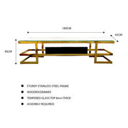 Add a touch of elegance to your living room with the Alexa Gold TV Unit. This unit features a sleek Gold frame with a clear glass top and white and Gold drawer. The unit measures 180cm x 40cm x 45cm and is made of polished steel, glass top, and wood drawer. Assembly is required.